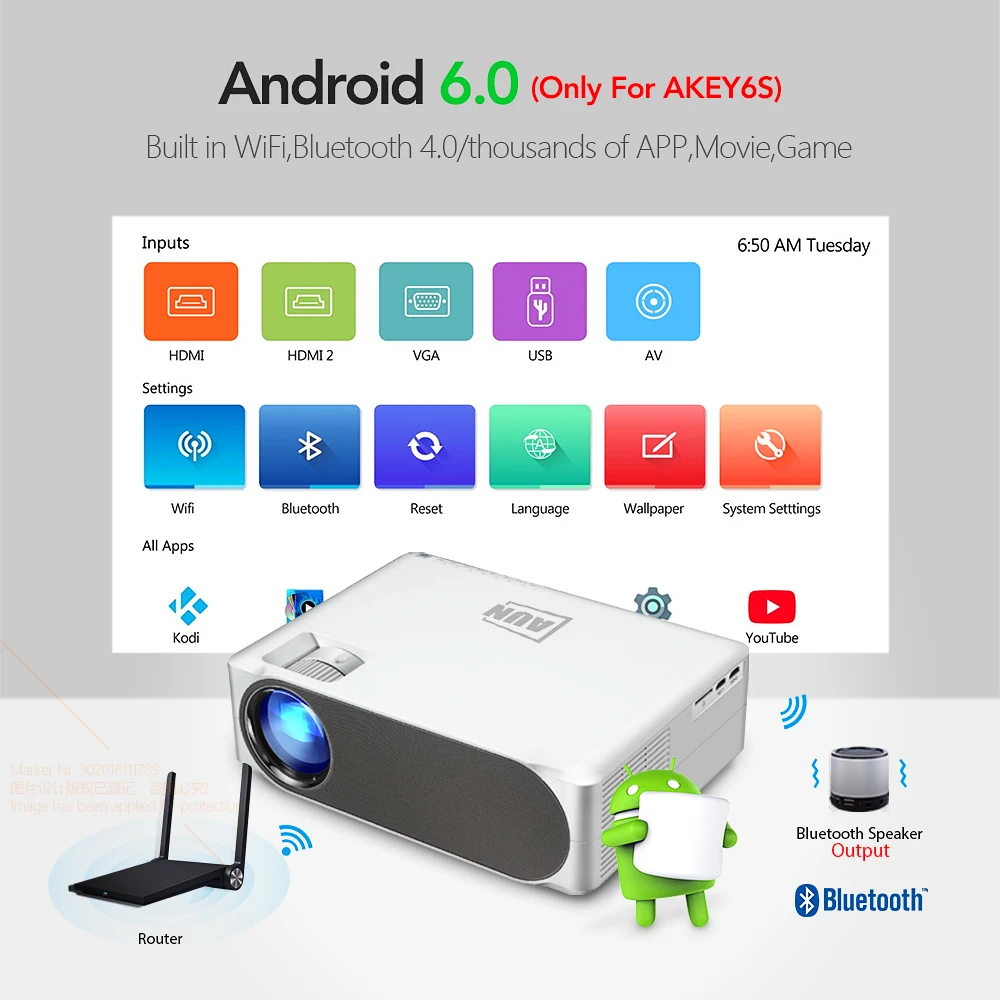 AUN Full HD Projector AKEY6/S, 6800 Lumens 1920x1080P Home Cinema(Optional Android 6.0 WIFI) HDMI VGA for GYM 4K Video Proyector