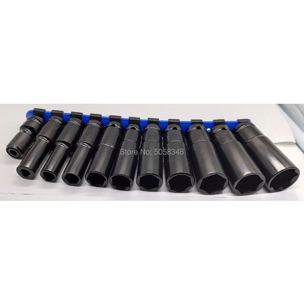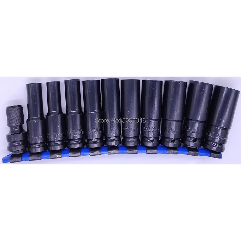 Socket number : 10piecesSocket size: 8cm, 10cm, 12cm, 13cm(or 14cm,random), 16cm(or 15cm ,random), 17cm, 19cm, 21cm, 22cm, 24cmhigh carbon steelRelease Chuck Converter for Cordless Electric Wrench: 1 piecePictures: