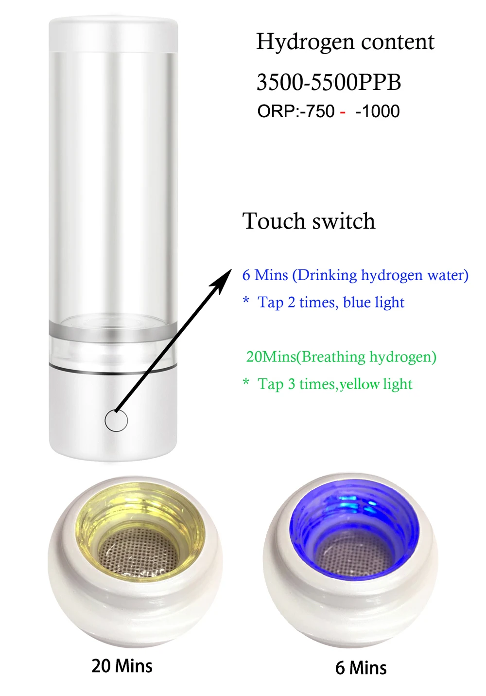 Electrolysis time: 6 Mins (Drinking hydrogen water) 20Mins(Breathing hydrogen)