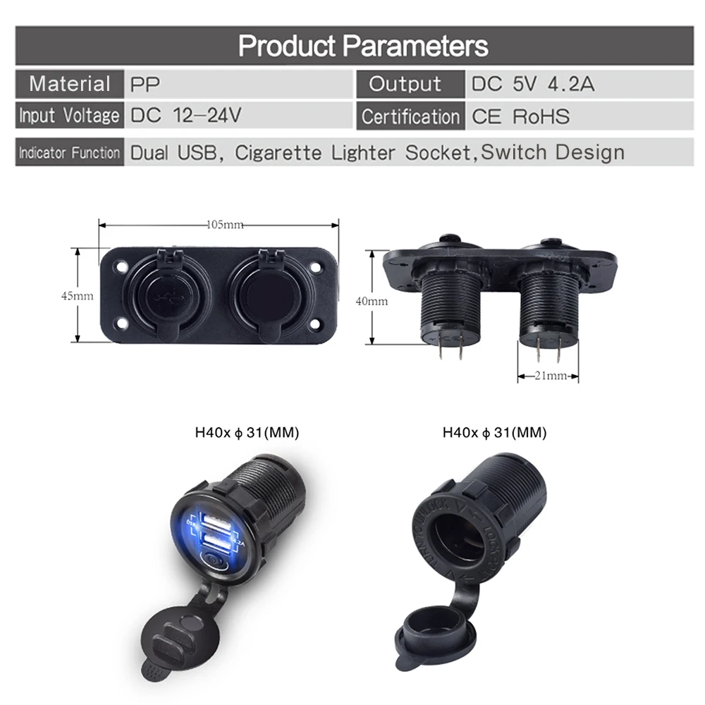 | Updated 12V-24V Dual USB Charger + Cigarette Lighter +Voltmeter Car USB Socket with Independent On/Off 2.1+2.1A Car Fast Charger |
